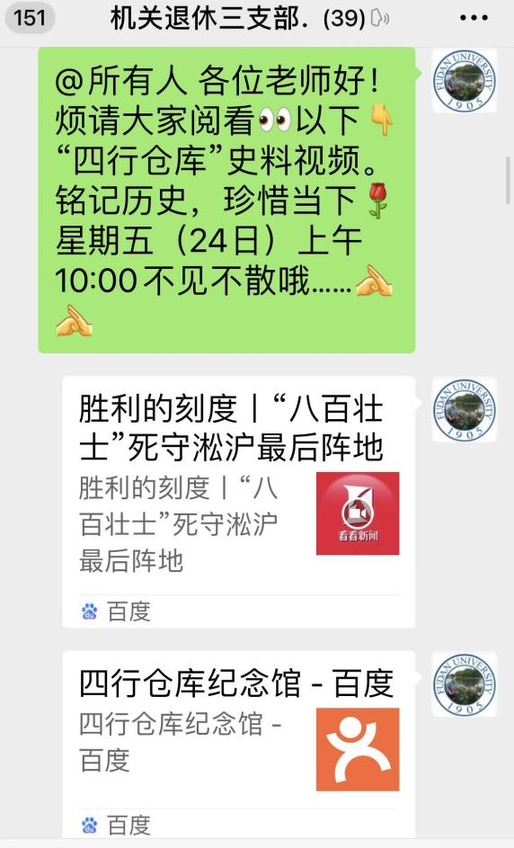 预习功课:党支部提前于参观出行前,在支部群发放关于四行仓库和松沪会战的背景资料视频,请大家带着问题去思考去学习。