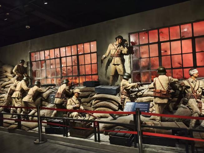 馆内的沙盘模型、雕塑、光影特效等,复原了“八百壮士”誓死坚守的战斗场景。党员同志们更加直观地感受到了战斗的惨烈和守军条件的艰苦,沉浸式体验极大地激发了党员老同志们的爱国共情。