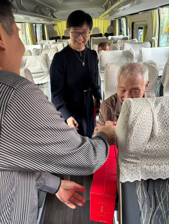 活动当天,陈莉书记和姚玉河副主任早早来到上车处,代表中心为教师们送上精心准备的重阳节礼物,并致以节日的诚挚问候。一份份满载心意的礼品,一句句暖心的祝福,大家笑逐颜开,现场洋溢着温馨与感动。