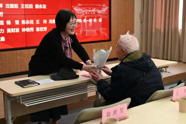 10月28日上午,放医所在2号楼二楼报告厅召开敬老节庆祝大会。退休党支部书记陆振林主持大会,近60位老同志欢聚一堂。副所长卓维海、党总支委员朱国英、所工会主席孔肇路带领党政办公室教师,为到场的10位“逢五逢十”老同志送上花束、祝寿卡和慰问祝福,“逢五逢十”老同志代表共同切蛋糕,同庆重阳佳节。