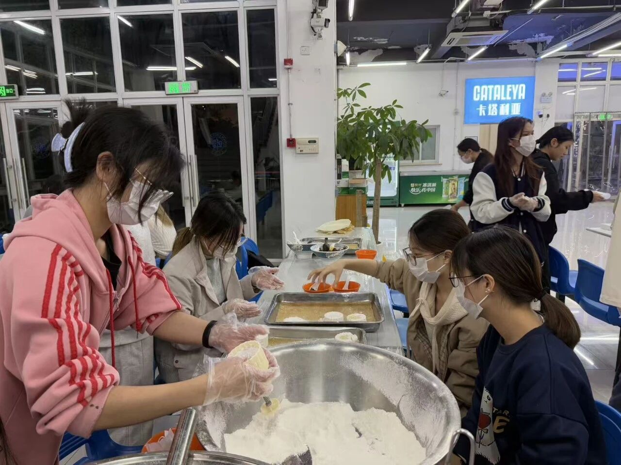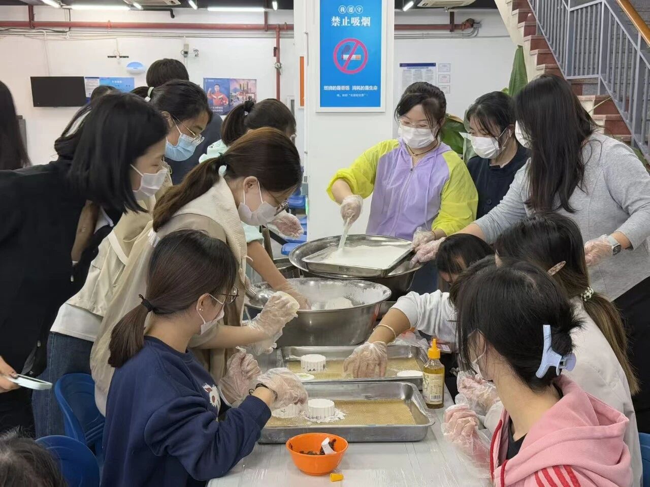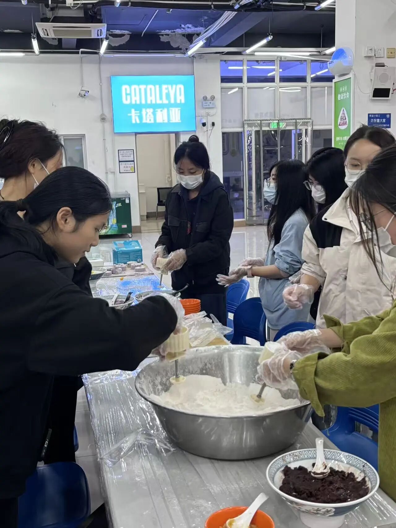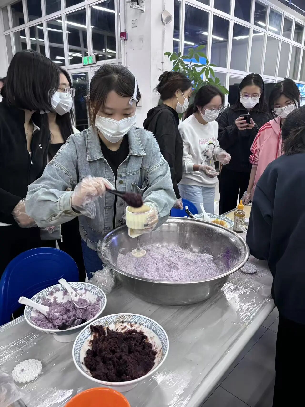 活动开始后,同学们分组围坐,纷纷动手实践。从初学乍练时粉团揉捏的生涩,到经负责人耐心指导后逐渐掌握要领;从相互交流铺馅技巧,到创意点缀桂花蜜——指尖翻飞间,不仅是对传统糕点的复原,更是年轻一代对文化的理解与再创造。一块块独具风格的重阳糕,在欢声笑语中逐渐成型,承载着心意,也联结起跨越时空的文化共鸣。