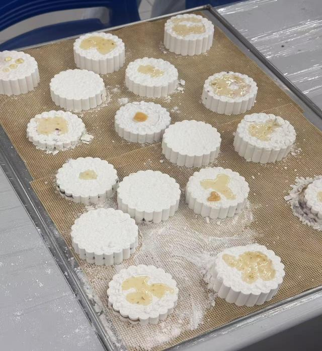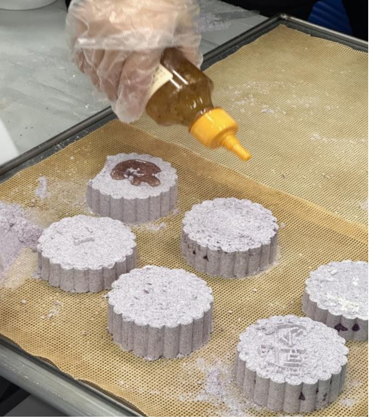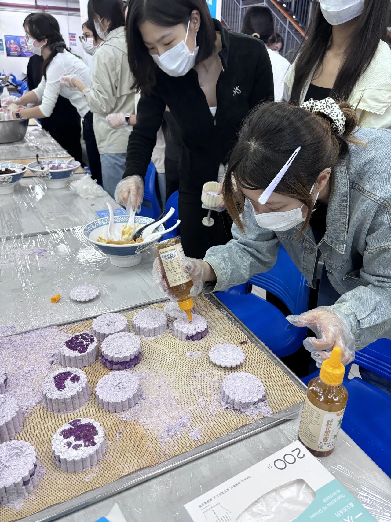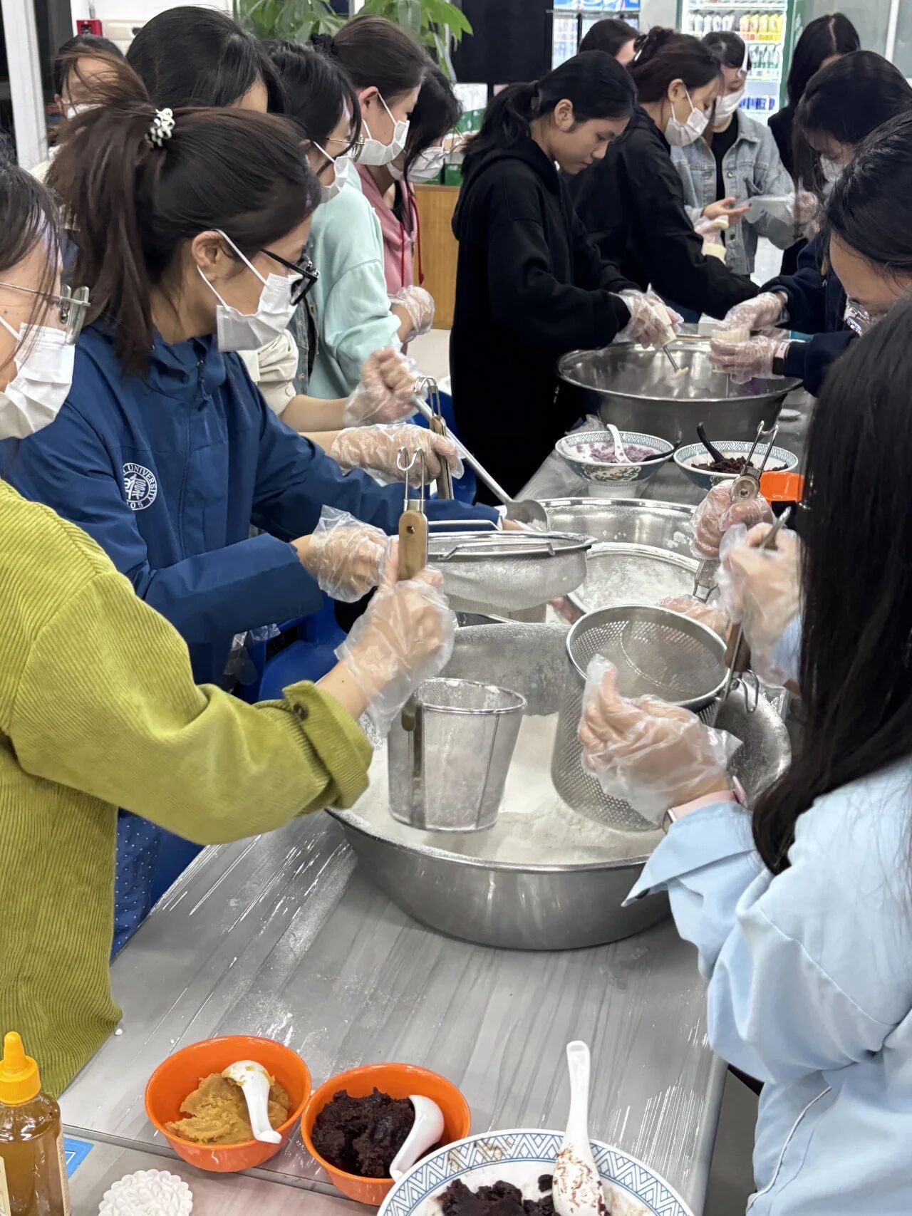 活动开始后,同学们分组围坐,纷纷动手实践。从初学乍练时粉团揉捏的生涩,到经负责人耐心指导后逐渐掌握要领;从相互交流铺馅技巧,到创意点缀桂花蜜——指尖翻飞间,不仅是对传统糕点的复原,更是年轻一代对文化的理解与再创造。一块块独具风格的重阳糕,在欢声笑语中逐渐成型,承载着心意,也联结起跨越时空的文化共鸣。