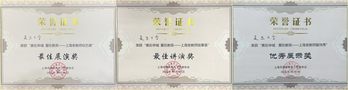 10月15日,首场系列活动“上海老教师综艺展”在宝山区青少年活动中心剧场隆重举行。来自全市教育系统的300余名退休教职工欢聚一堂,用艺术表达对教育事业的深厚情感。我校退休教工合唱一团精心排演的女声小组唱《葡萄园夜曲》婉转动听,展现了高水平的艺术素养,从众多节目中脱颖而出,荣获“最佳展演奖”。合唱团女老师们的精彩演绎,不仅赢得了全场热烈掌声,更展现了复旦退休教师深厚的文化底蕴。