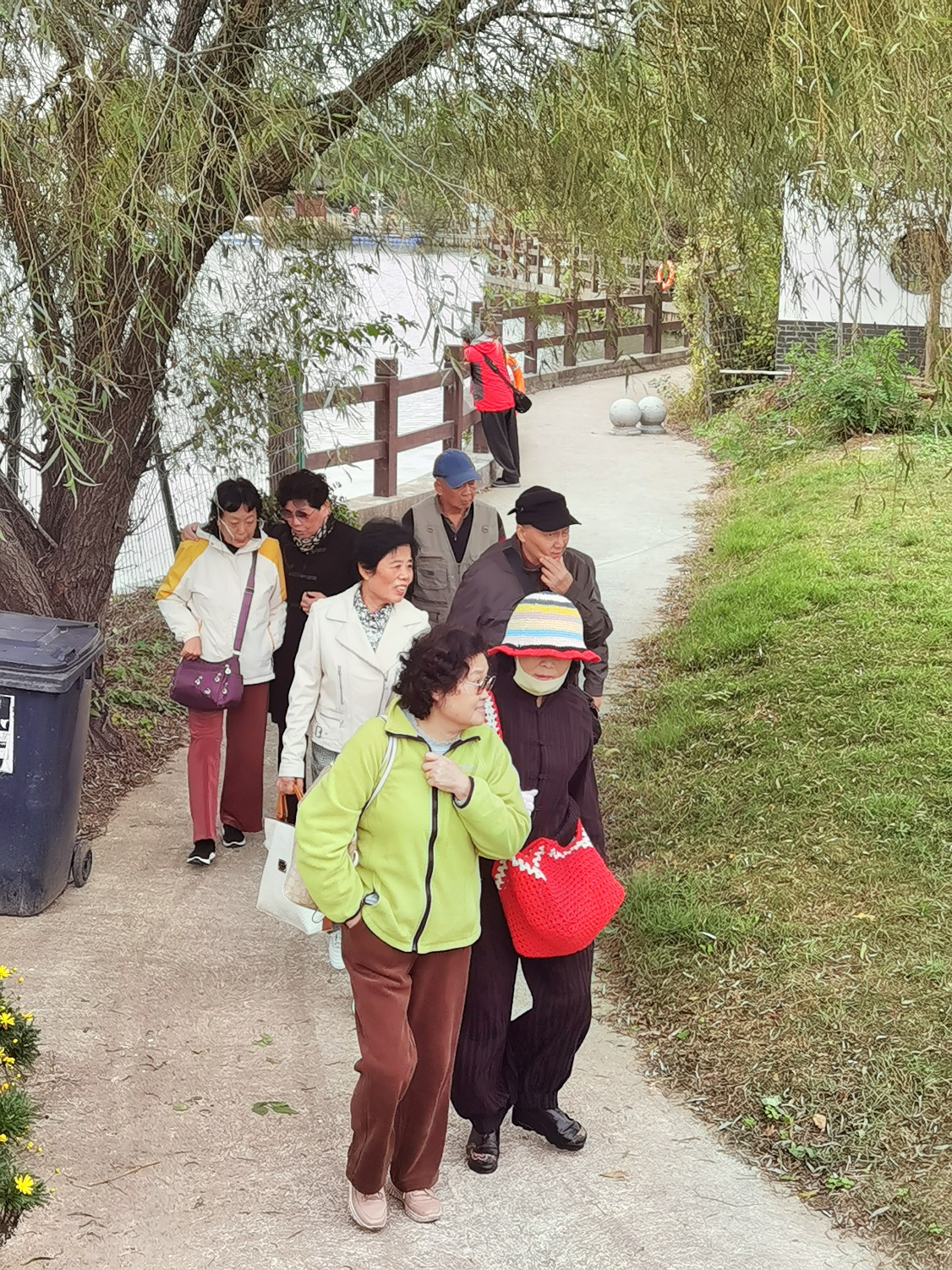 哥几个同框,沾一点农民丰收节的喜气,满心的欢喜。姐几个牵手,走在乡间田园的小道上,一个回眸,难掩的浪漫,别样的情趣。登高眺望,蓝天与湖水间园区的景致一览无余。虽然是退休老师们的游园团队,漫步在这自然秘境中,吸吮着大自然的灵气,大家相谈甚欢,轻盈的身影,多样的肢体语言,换发出了青春的朝气。