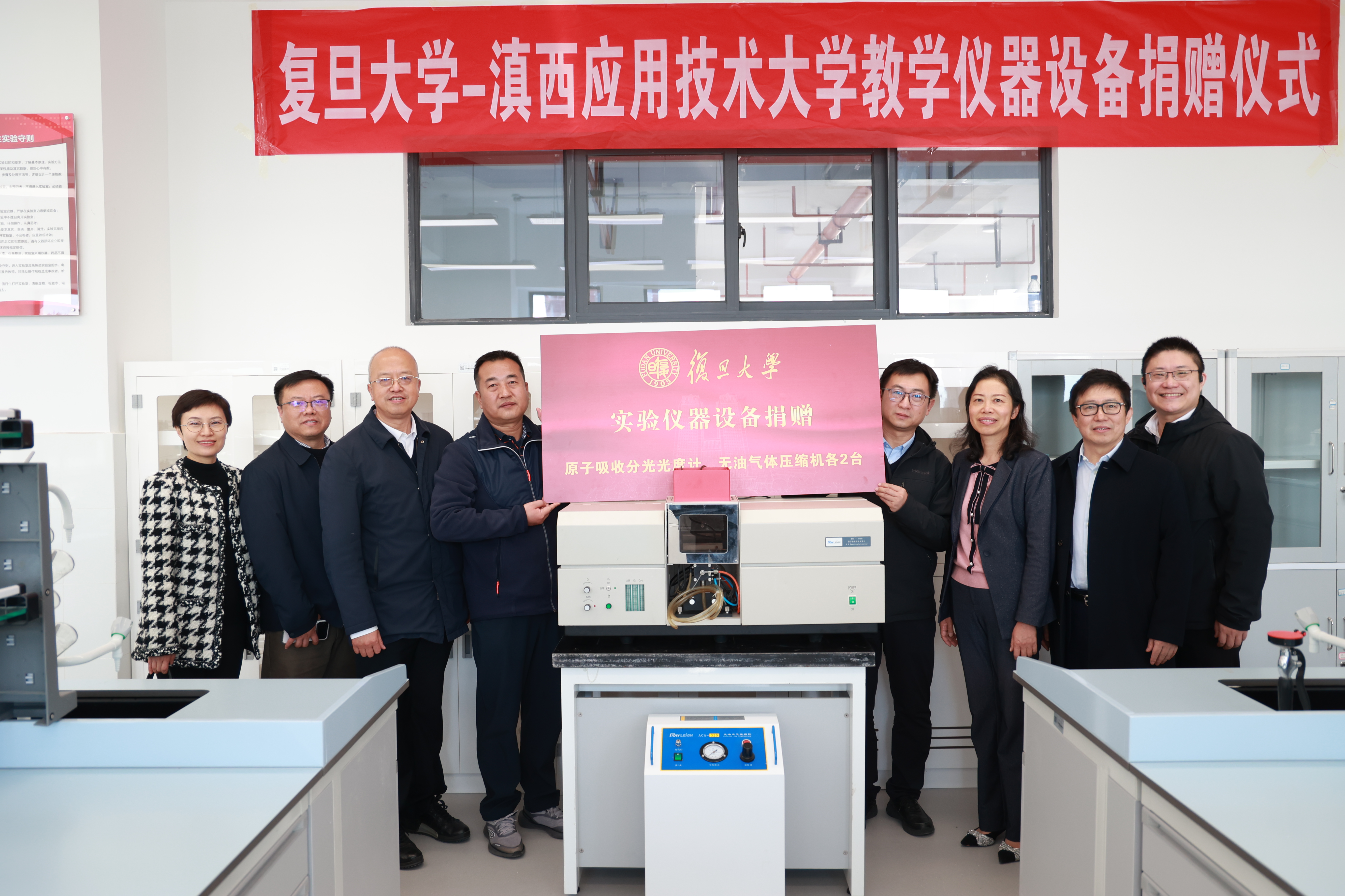 随后,考察团一行来到实验实训大楼六楼实验室,共同出席实验仪器设备捐赠仪式。仪式上,复旦大学向滇西应用技术大学捐赠原子吸收分光光度计、无油气体压缩机各两台,助力其改善实验教学条件、提升科研能力水平。