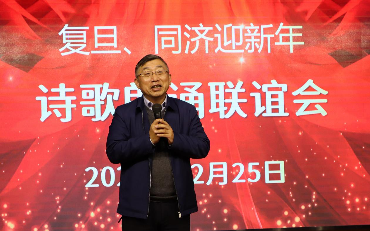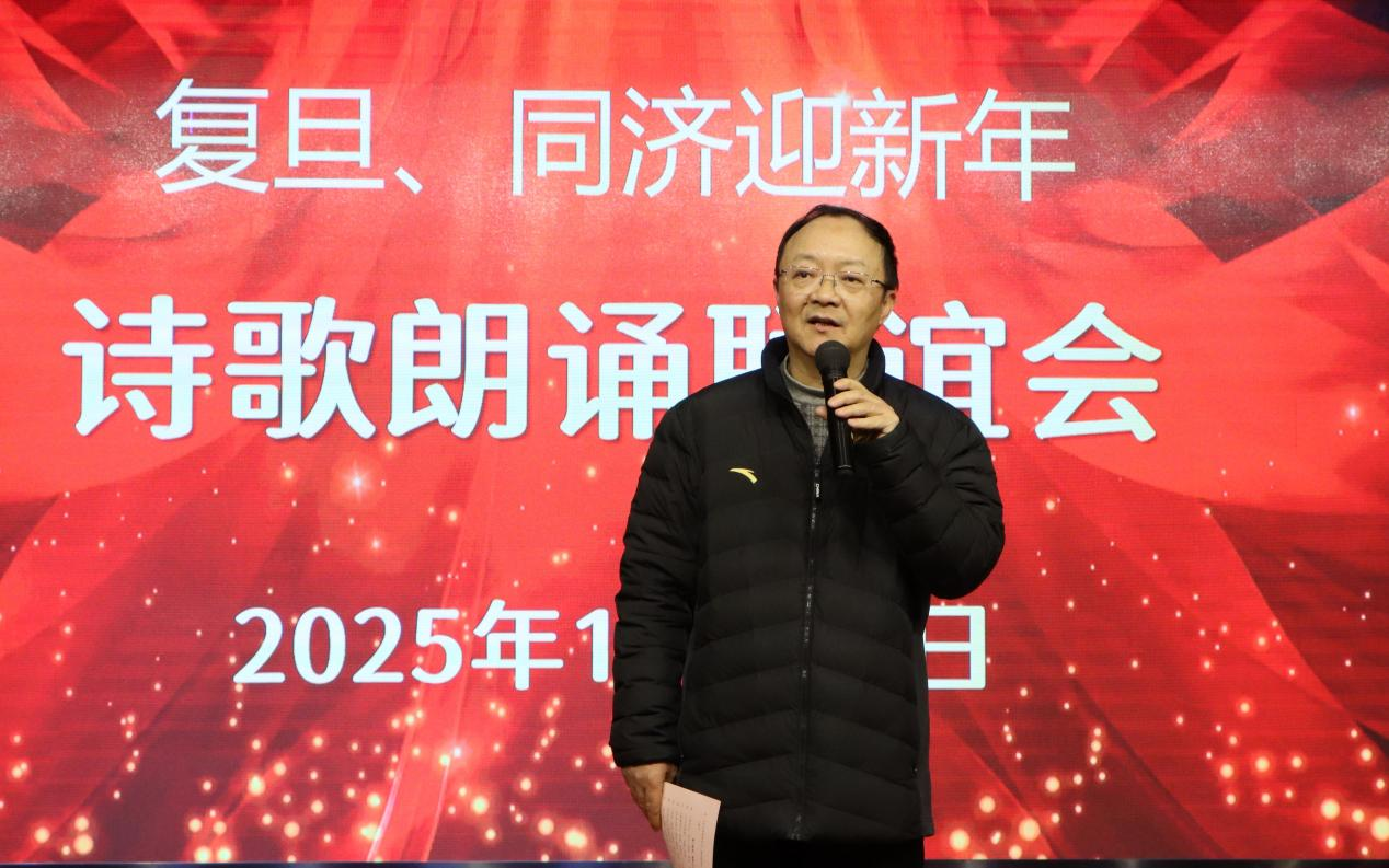 活动在温馨融洽的氛围中拉开帷幕。复旦大学老干部党委书记、退休教职工工作处处长周桂发在致辞中回顾了两校自签署战略合作协议以来,退休社团在书画、摄影、乒乓、象棋等领域的密切交流。他特别提到,此次朗诵联谊是两校文化交融的又一佳话,期待未来能开展更多形式的互动,并祝愿两校老同志新年安康、阖家幸福。同济大学离退休干部党工委副书记倪佩琼笑言,每逢两校老同志相聚,天气总是格外晴好,她期待以诗歌为媒介,共度美好午后,并祝愿两校合作日久弥新。复旦大学工会副主席金再勤对大家来到工会场地表示热烈欢迎,他动情地说:“复旦与同济比邻而居,日月光华,同舟共济,今天能在此聆听诸位老师用声音传递诗意,实为一件美事。”复旦大学退休教职工工作处副处长葛锡颖等也出席了本次活动。