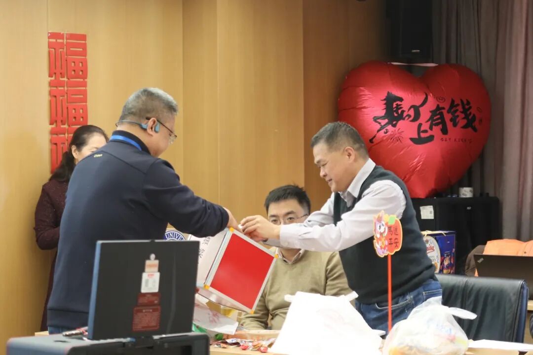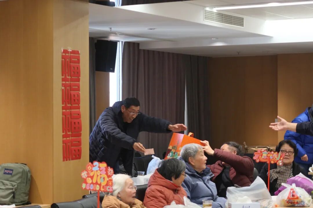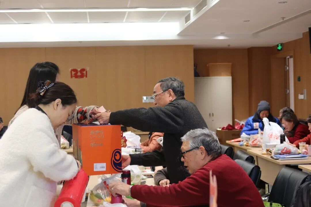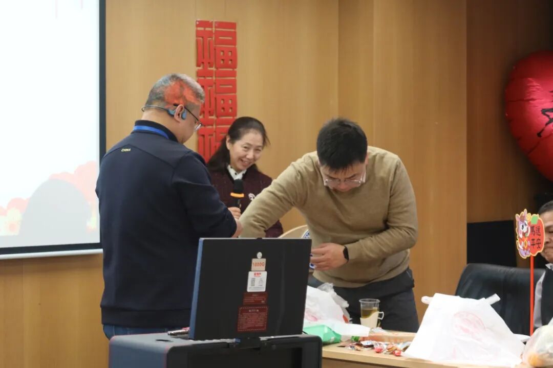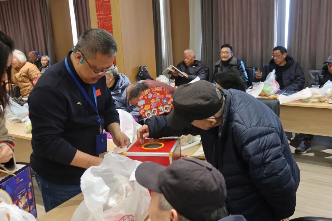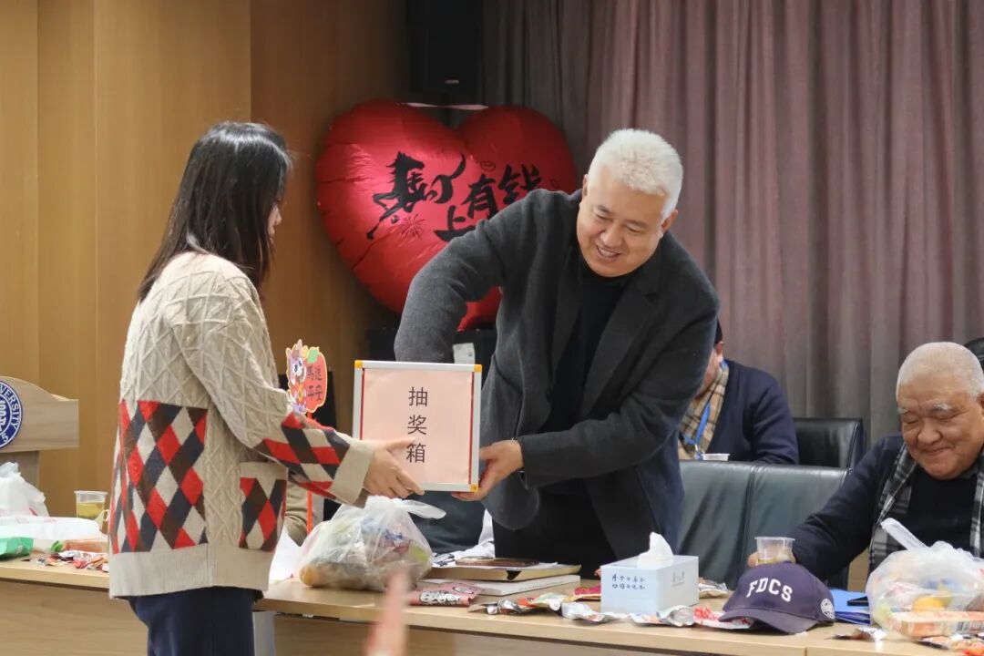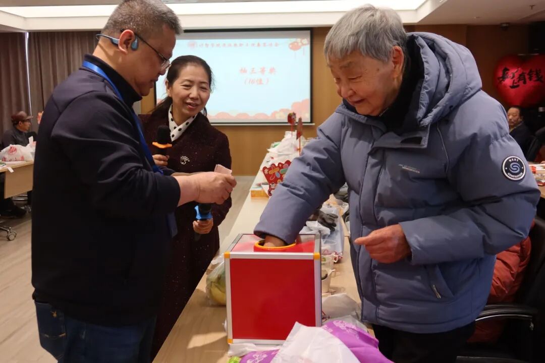 茶话会抽奖环节。吴立德、施伯乐两位老师共抽取了16个三等奖,副书记邹宏、顾宁老师抽取了8名二等奖,王新老师抽取了2名一等奖,中奖的退休教职工们脸上洋溢着幸福的笑容,纷纷表示这是新年收到的最好礼物。