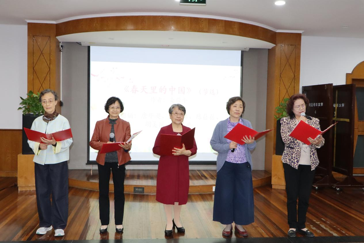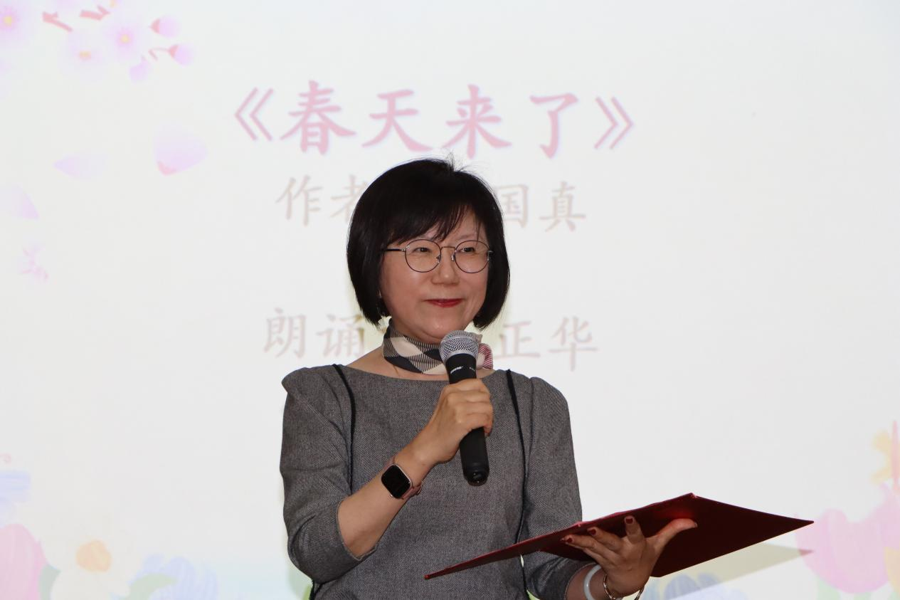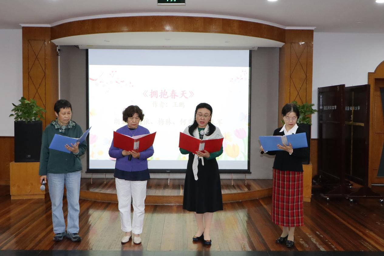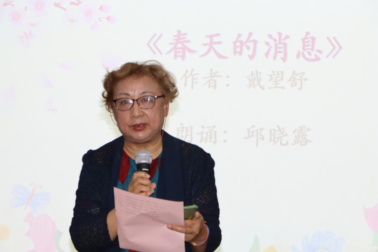 家书寄情,春意萌动。在热烈的掌声中,第二篇章“拥抱春天”如约而至。王正华老师率先带来汪国真的《春天来了》,明朗轻快的节奏仿佛将春风引入室内,令人心旷神怡。应萱同老师则朗诵了自己的原创作品《春日花语》,以亲身感悟的文字与声音,诉说退休教工眼中独有的春日诗意。张欣老师自己创作并深情朗诵的《春讯》,灵动而真挚,别具一番动人的力量。经典与原创交织,独诵与合诵辉映。王丽军老师演绎林徽因的《你是人间四月天》,温柔婉转,尽显四月天的明媚与深情;唐华英、晁英伟、陈蓓蓓、胡美凤、刁慧平五位老师合诵的《春天里的中国》,气势恢宏,将对祖国的热爱融入盎然春意之中。华莉老师带来的朱自清名篇《春》,语言清新如洗,仿佛将听众带入草长莺飞的田野;邱晓露老师朗诵戴望舒的《春天的消息》,含蓄隽永,余韵悠长。
