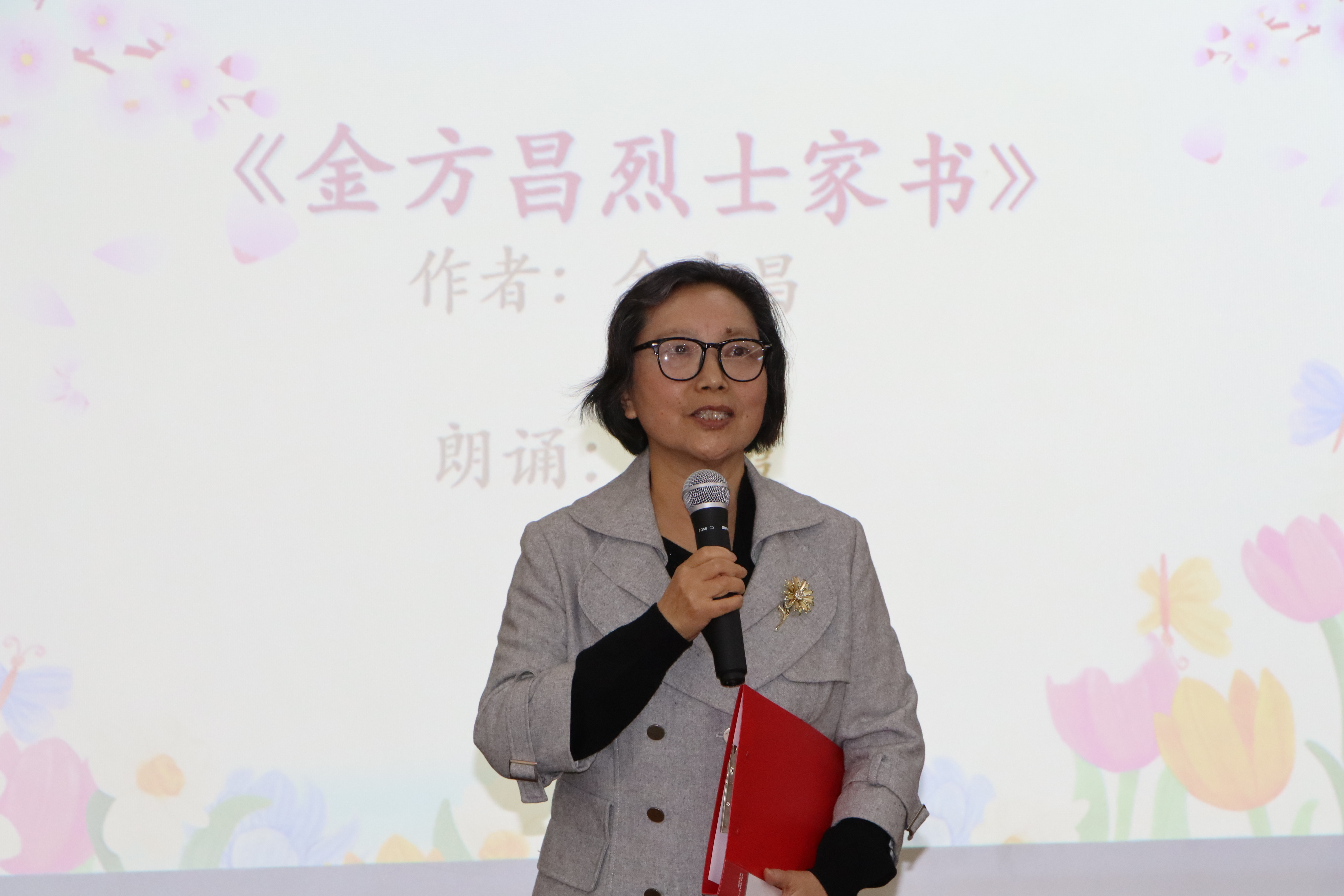 在悠远而庄重的氛围中,活动的第一篇章“家书”徐徐展开。林霞老师率先登台,以深沉而坚定的语调朗读了《金方昌烈士家书》,字字铿锵,将革命者铁骨柔情与家国大义展现得淋漓尽致,令在场观众无不动容。朱旭东、柳湘华、蒋以铮三位老师合作的《一封没有寄出的信》,则以默契的配合与层次丰富的表达,将一封深埋心底的信件化作一场跨越时空的对话,将第一篇章的情感推向高潮。随后,任琳芳老师深情演绎邓颖超同志的《海棠花祭》,将对革命伴侣的深切怀念融入花开花落之间,情感细腻,催人泪下。梁宁菁老师带来《一纸家书,情暖岁月》,声音温润如玉,道出了寻常家信背后不寻常的岁月温度。