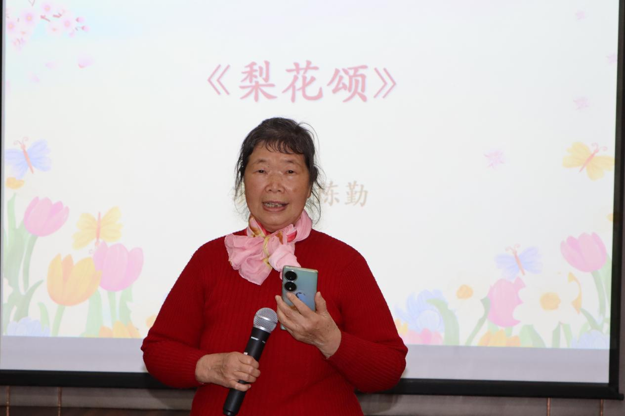 点评与示范环节结束后,朗诵成员陈勤老师为大家倾情献上了京曲《梨花颂》。她字正腔圆、韵味悠长,一开腔便赢得满堂喝彩。那婉转的唱腔如梨花带雨,将传统戏曲之美带入春日的午后,为整场朗诵会增添了一抹别样的艺术亮色。最后,在温馨而热烈的氛围中,大家共同合影留念,本次“家书·春晖”诗歌朗诵会顺利落下帷幕。春晖遍洒,诗意不息。这场由白发与诗行共同谱写的春日雅集,必将成为每一位参与者心中难忘的温暖记忆。