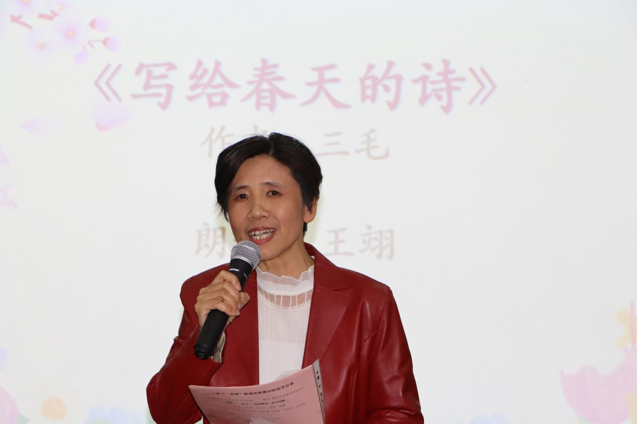 随后,刘依、梅林、何秀芬、朱军四位老师合诵的《拥抱春天》节奏明快,充满朝气;严海燕老师的《春暖花开》温暖治愈,令人心生希望。章开俭老师再次演绎《春天里的中国》,情感更为饱满,视角别具一格。王翊老师带来三毛的《写给春天的诗》,率真洒脱,别有风情。唐华英老师的《春风万里盛世中国》气势磅礴,将个人情感与时代气象融为一体。顾天珍老师的《三月》、高晓虹老师的《我喜欢春天》,或细腻、或灵动、或质朴,共同构成了一幅绚烂多彩的春日长卷。